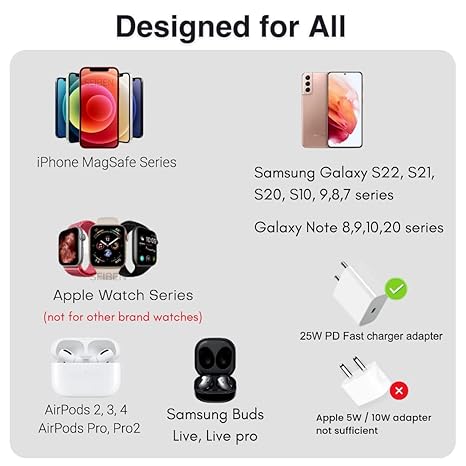 Smartwatches: Designed to accommodate popular smartwatch models, keeping your wrist device powered throughout the day.